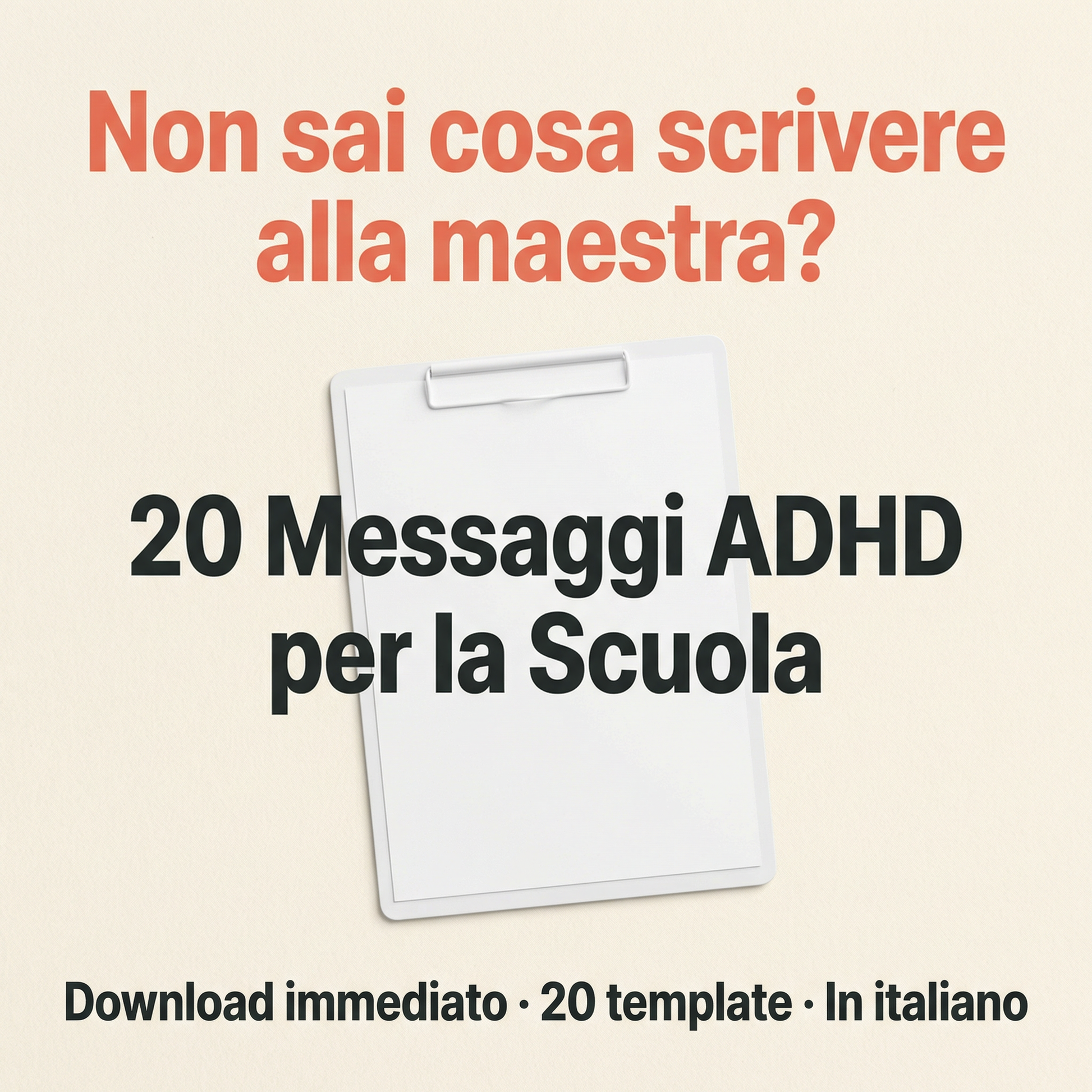 20 Messaggi Pronti per la Scuola – ADHD è una raccolta di template in italiano, già scritti e pronti da copiare, per comunicare con insegnanti, coordinatori e dirigenti scolastici in modo chiaro, rispettoso ed efficace.